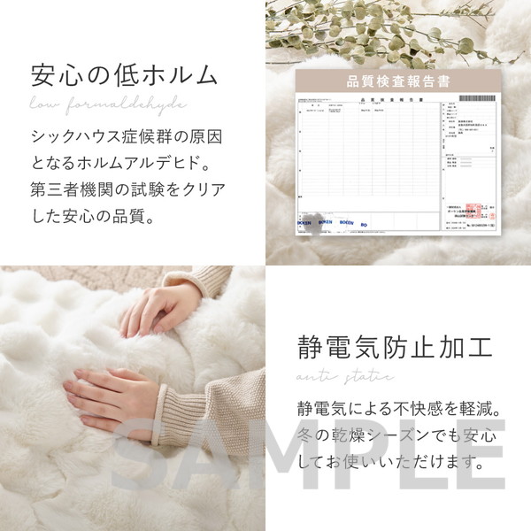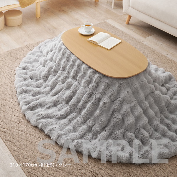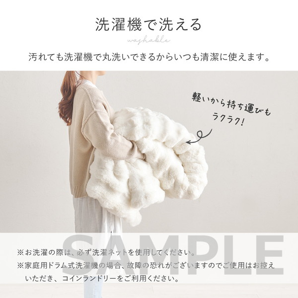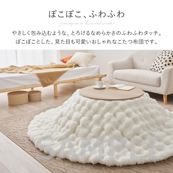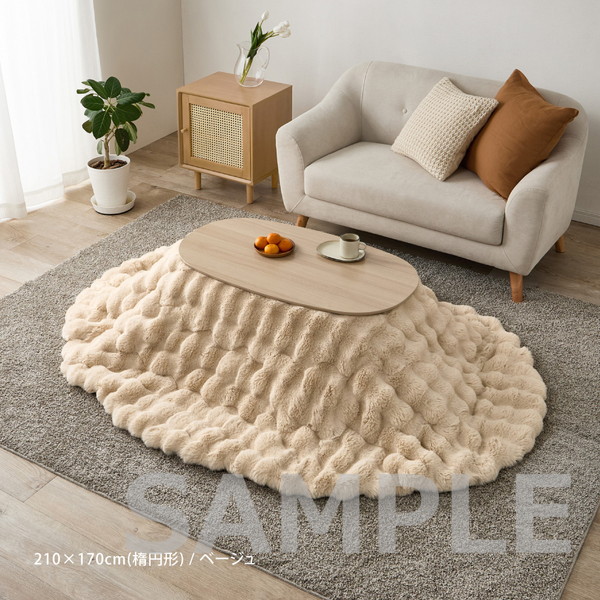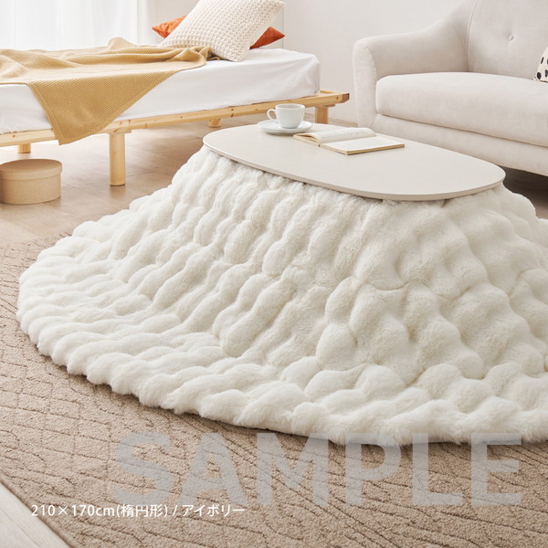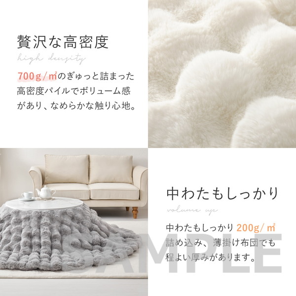 うさぎの毛並みを表現した「ラビットファー調」は、きめ細やかでうっとりするような、なめらかな肌ざわり。やさしく包み込むようなふわふわタッチに、ぽこぽことした見た目も可愛いおしゃれなこたつ布団です。かさばらずすっきりと使いやすい薄掛けタイプのこたつ布団ですが、たっぷりの中わた入りでボリュームがあり、ぎゅっと詰まった高密度な長毛パイルが空気を多く含み、あたたかさを保ち快適に。また、洗濯機で洗えるから汚れても安心、いつも清潔にお使いいただけます。