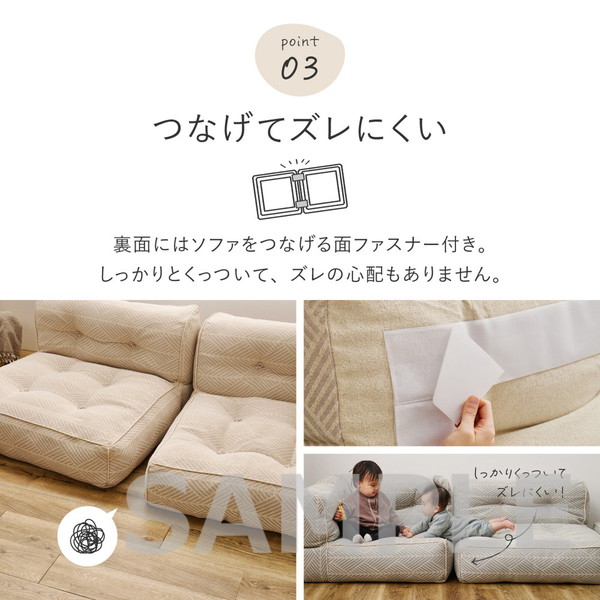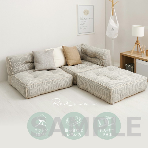 インド綿100%のやわらかく優しい風合いのフロアソファ『レトア』。空間を広くみせるロースタイルに、レイアウトも自由自在!単品使いはもちろん、ゆったりのロングソファやカウチソファ風など、用途やお部屋に合わせて使えるマルチなソファです。裏面に面ファスナー付きで、ソファ同士がしっかりとくっついてズレの心配もありません。