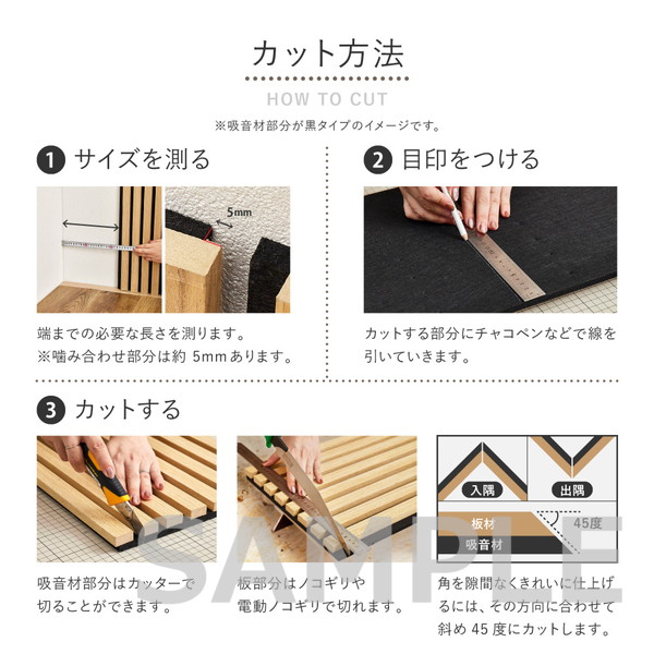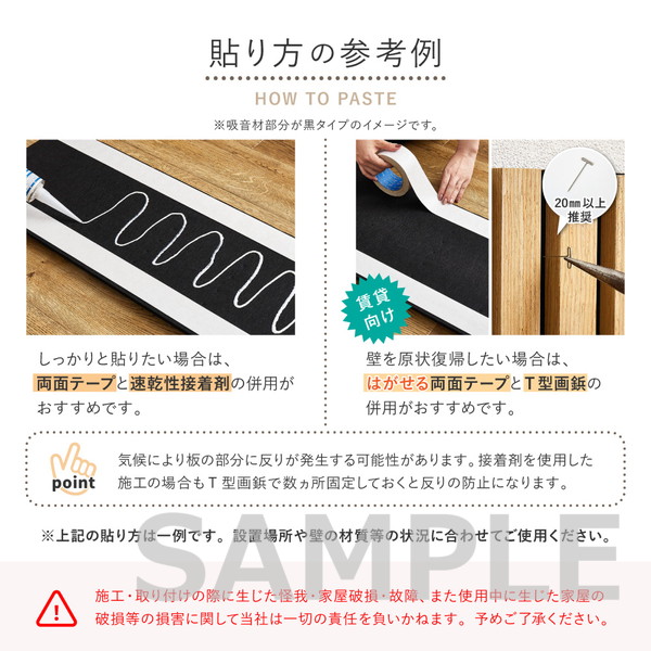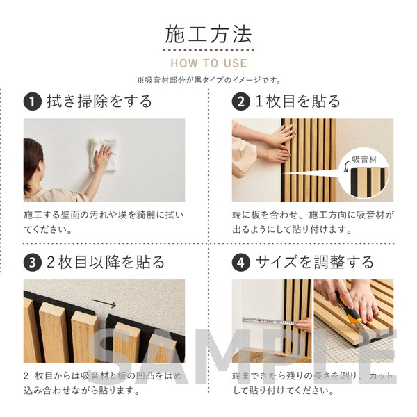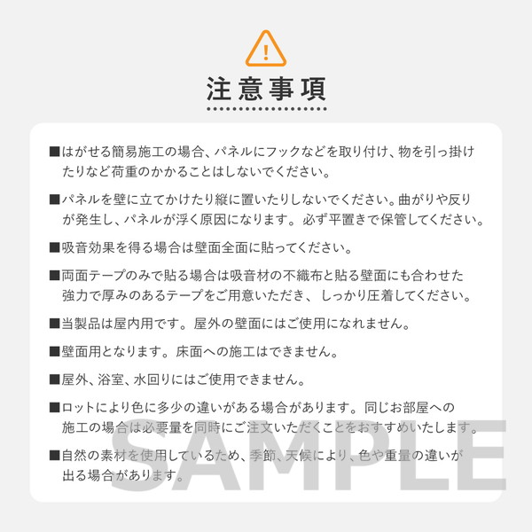注意事項 | ・はがせる簡易施工の場合、パネルにフックなどを取り付け、物を引っ掛けたりなど荷重のかかることはしないでください。 ・パネルを壁に立てかけたり縦に置いたりしないでください。曲がりや反りが発生し、パネルが浮く原因になります。必ず平置きで保管してください。 ・吸音効果を得る場合は壁面全面に貼ってください。 ・両面テープのみで貼る場合は吸音材の不織布と貼る壁面にも合わせた強力で厚みのあるテープをご用意いただき、しっかり圧着してください。 ・当製品は屋内用です。屋外の壁面にはご使用になれません。 ・壁面用となります。床面への施工はできません。 ・屋外、浴室、水回りにはご使用できません。 ・ロットにより色に多少の違いがある場合があります。同じお部屋への施工の場合は必要量を同時にご注文いただくことをおすすめいたします。 ・自然の素材を使用しているため、季節、天候により、色や重量の違いが出る場合があります。 |