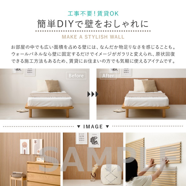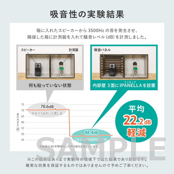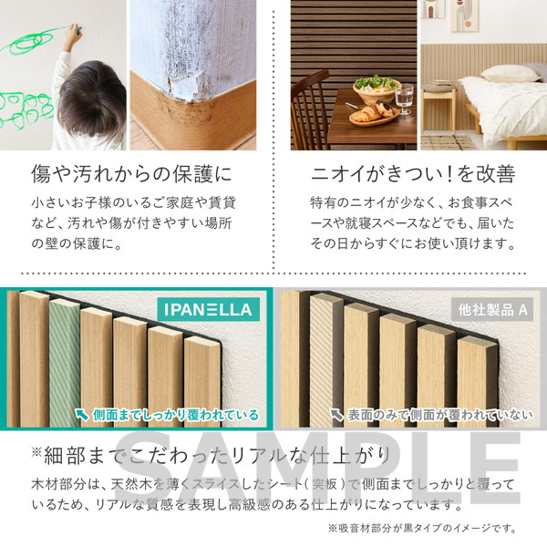 工事不要・簡単施工でお部屋の壁をおしゃれにできる吸音パネル IPANELLA(イパネッラ)。裏面の吸音材が気になる生活音を吸音してくれるので、話し声やペットの鳴き声、テレビ・オーディオの音量など家庭内での気になる『音』の対策に。おしゃれな木目でお部屋のイメージをガラリと変えられ、壁を原状回復できる施工方法もあるため、賃貸にお住まいの方でも気軽にお使いいただけます。