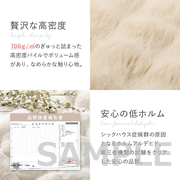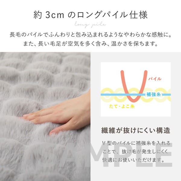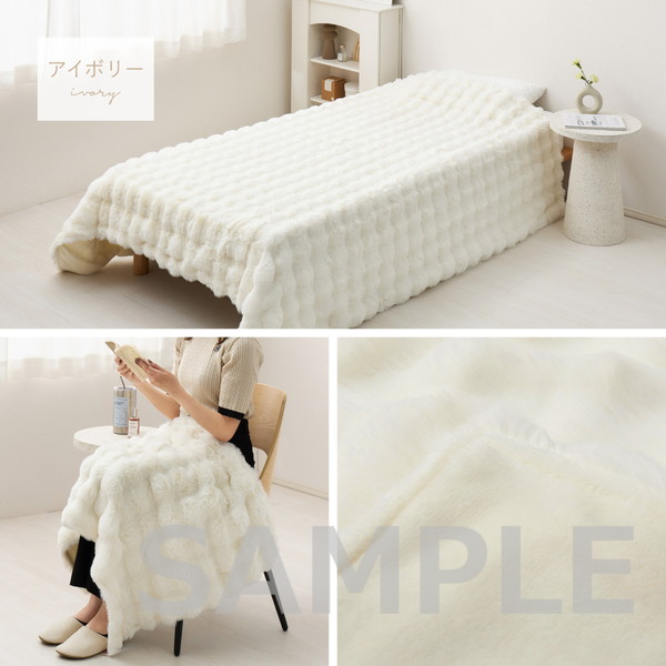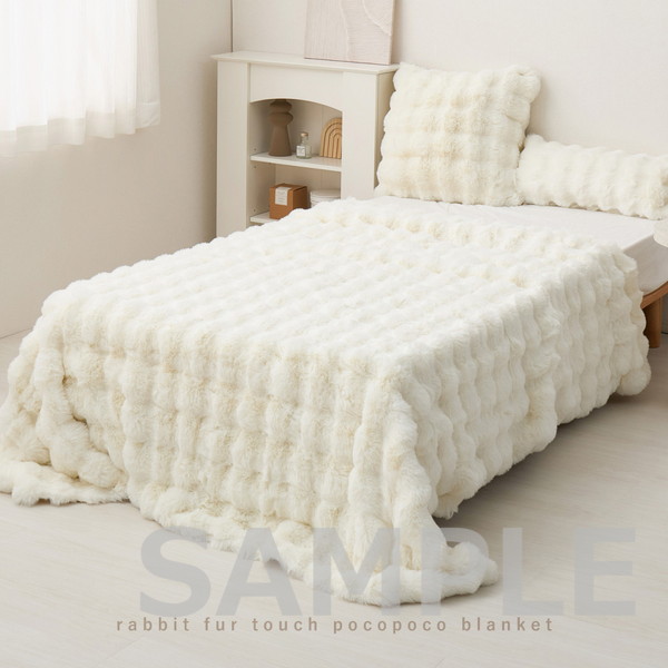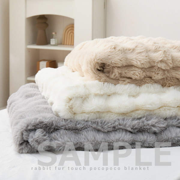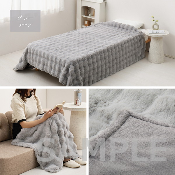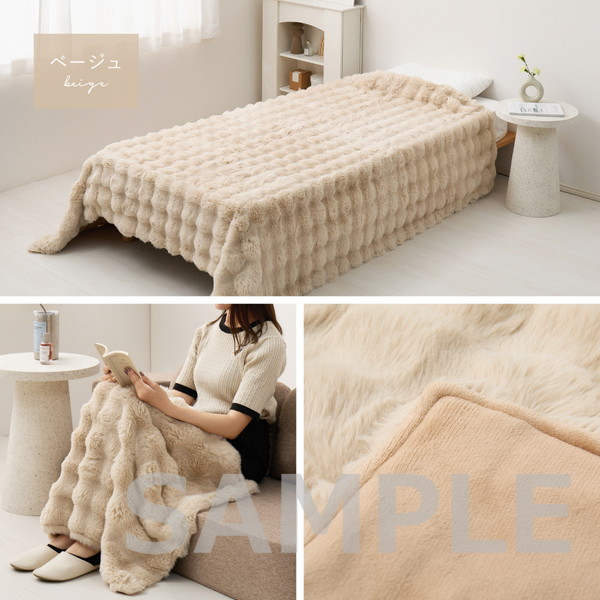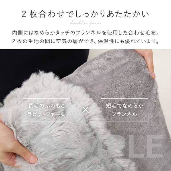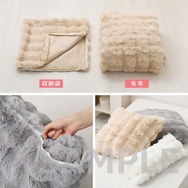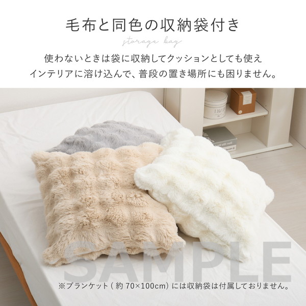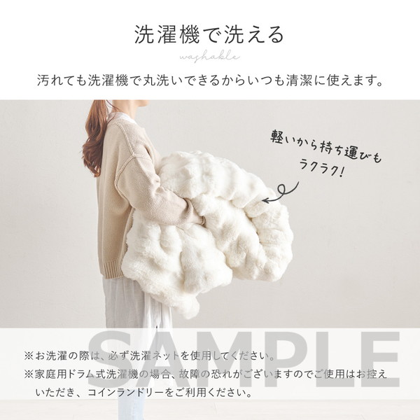 うさぎの毛並みを表現した「ラビットファー調」は、きめ細やかでうっとりするような、なめらかな肌ざわり。やさしく包み込むようなふわふわタッチに、ぽこぽことした見た目も可愛いおしゃれな毛布。ぎゅっと詰まった高密度な長毛パイルの表生地と、保温性と保湿性に優れたフランネルの裏生地の2枚合わせでほどよくボリュームがあり、しっかりとあたたかさを保ちます。また、汚れても洗濯機で丸洗いできるからいつも清潔&快適に。毛布と同色の収納袋付きで、使わないときは袋に収納してクッションとしても使え、普段の置き場所にも困ることなく持ち運びにも便利です。(※ブランケットサイズ(約70×100cm)には付属していません。)