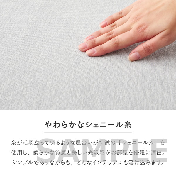 糸が毛羽立っているような風合いと、美しい光沢感がお部屋を優雅に演出してくれるシェニールラグ。足元をやさしく包み込むような柔らかな肌触りのシェニール糸を使用し、毛足が短くゴミも絡まりにくいため普段のお手入れは簡単。また爪などが引っかかりにくく、ペットと暮らすご家庭にもおすすめです。大判サイズで、広々とくつろげる大きめのラグとしてやお部屋に敷き詰めるカーペットとしてもお使いいただけます。