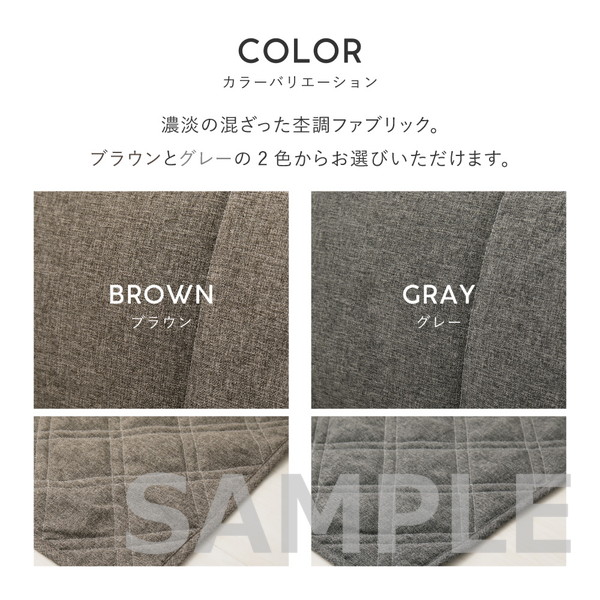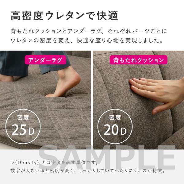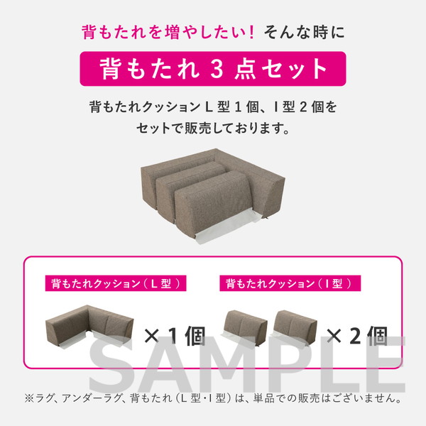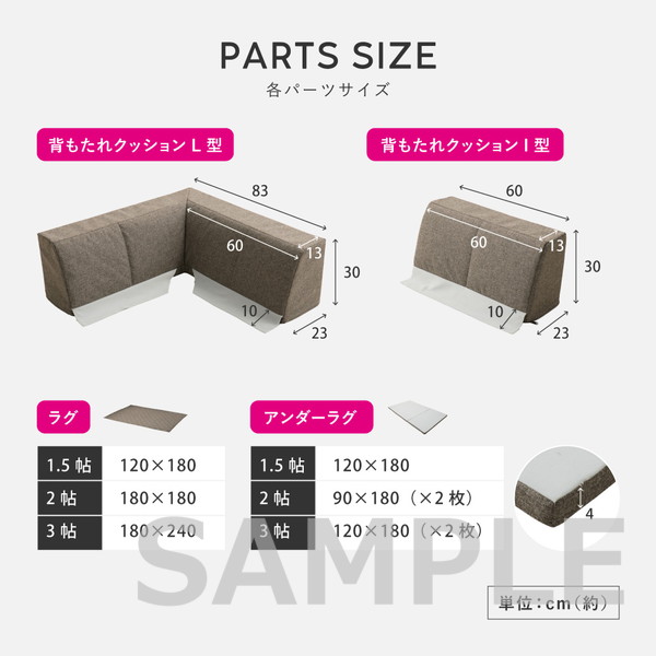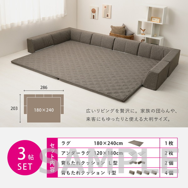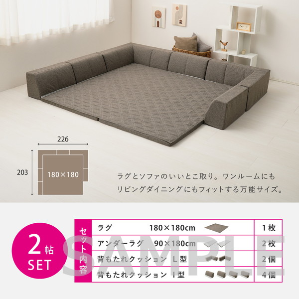 | 素材 | ■ラグ 表面:ポリエステル100% 中材:ポリエステル100% 裏面:ポリエステル100% ■アンダーラグ 表面:ポリエステル100% 中材:ウレタンフォーム(25D) 裏面:ポリエステル100%(すべり止めドット付き) ■背もたれクッション(L型・I型) 表面:ポリエステル100% 中材:ウレタンフォーム(20D) |