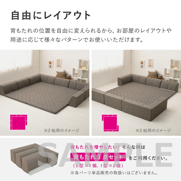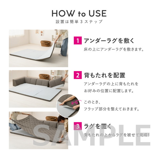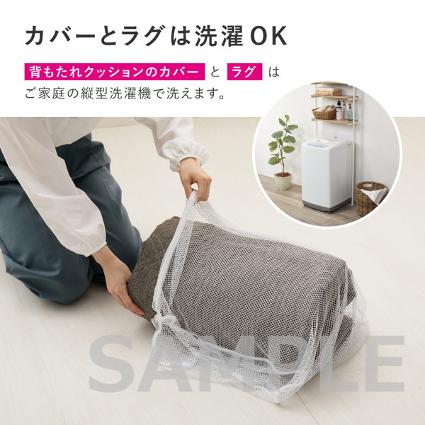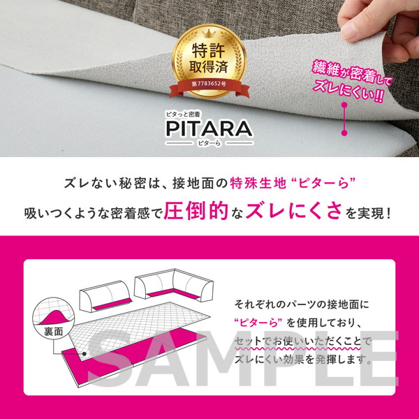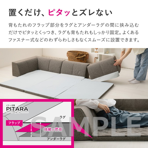 置くだけでピタッと密着!敷くだけでズレにくい特殊構造を採用した「ピターら」シリーズのラグソファ。ラグ・アンダーラグ・背もたれクッションを組み合わせて、背もたれの位置を自由にかえられるから、目的や人数にあわせて、様々なシーンへ対応できます。カバーは外して洗えるので清潔さをキープできるのも嬉しいポイント。さらりとした肌触りの生地で、オールシーズン快適にお使いいただけます。