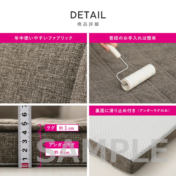 | 注意事項 | ※アンダーラグは圧縮梱包でお届けします。開封後、製品が元の形に戻るまでの時間は、環境などの条件によって異なります。 |