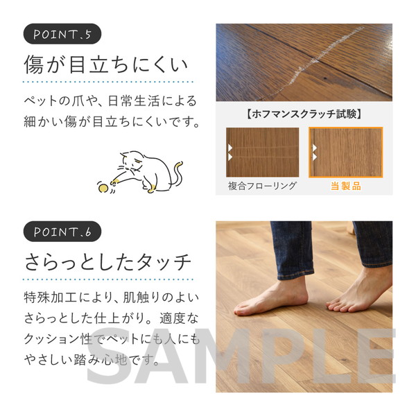表面のコーティングによりワックスいらずでお手入れ簡単!防滑性・耐久性を備え傷がつきにくく、通常のクッションフロアより厚みがあり適度なクッション性でペットの足腰への負担を軽減します。抗菌・抗ウイルス機能付きで衛生面も安心。約182cm幅のラグサイズで広々使いやすく、カットもできるため必要な場所に応じてお使いいただけます。