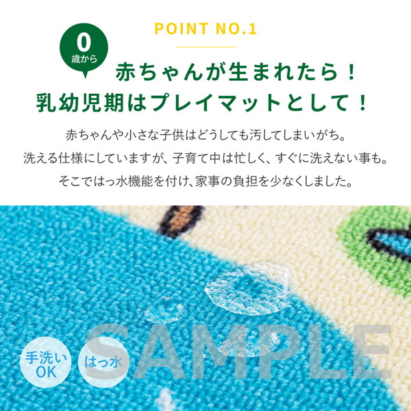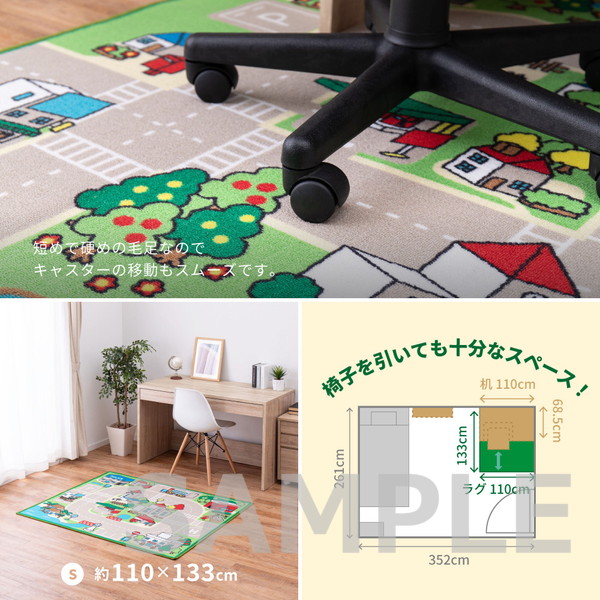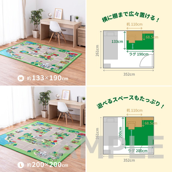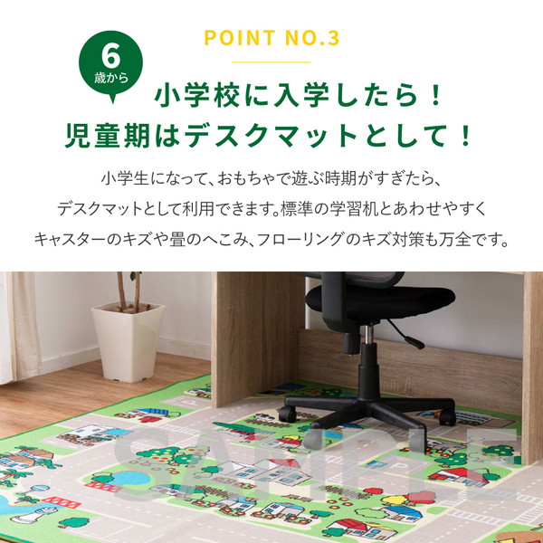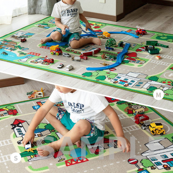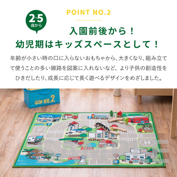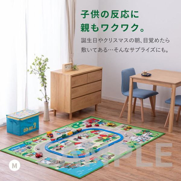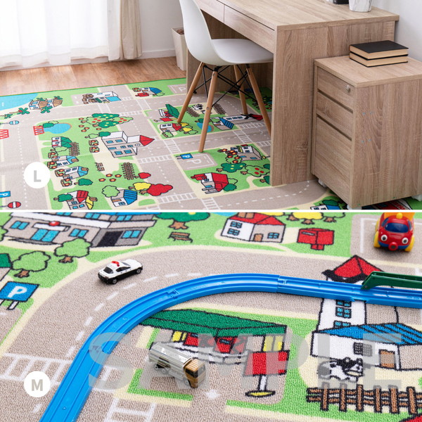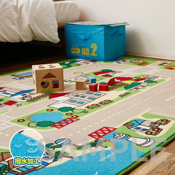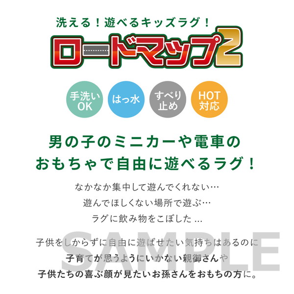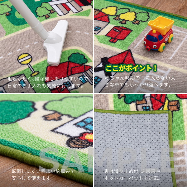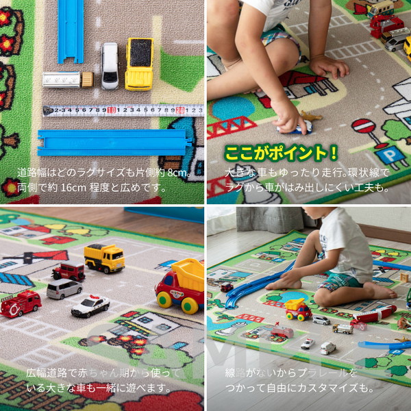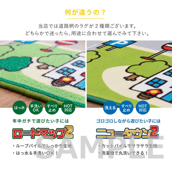 赤ちゃん期はプレイマット、幼児期はキッズコーナーマット・キッズラグ、小学生児童期は学習デスクマットで長く使える道路マップ柄ラグ。誕生日やクリスマスのプレゼントにも人気です。ループパイルはサラッとした感触で弾力性と耐久性があり、しっかりとした踏み心地。毛足がカットされていないため、ホコリやゴミが入り込みにくく、掃除がしやすいのもポイント。はっ水加工を施しているため飲みこぼしなどもサッと拭き取れシミになりにくく、汚れても手洗いOK。裏面は滑りにくい加工付き。ホットカーペットや床暖房に対応しており、オールシーズンお使いいただけます。