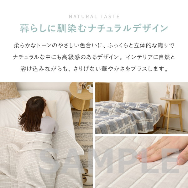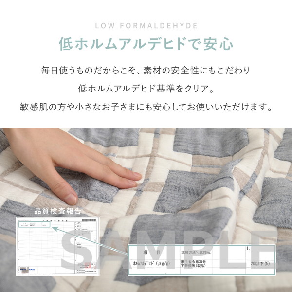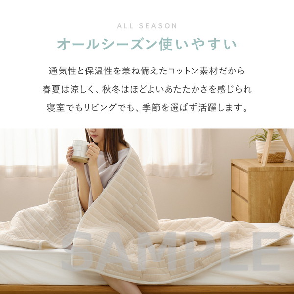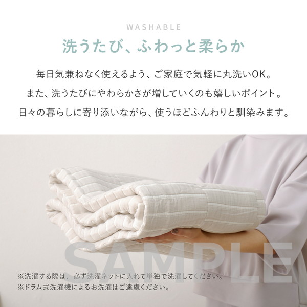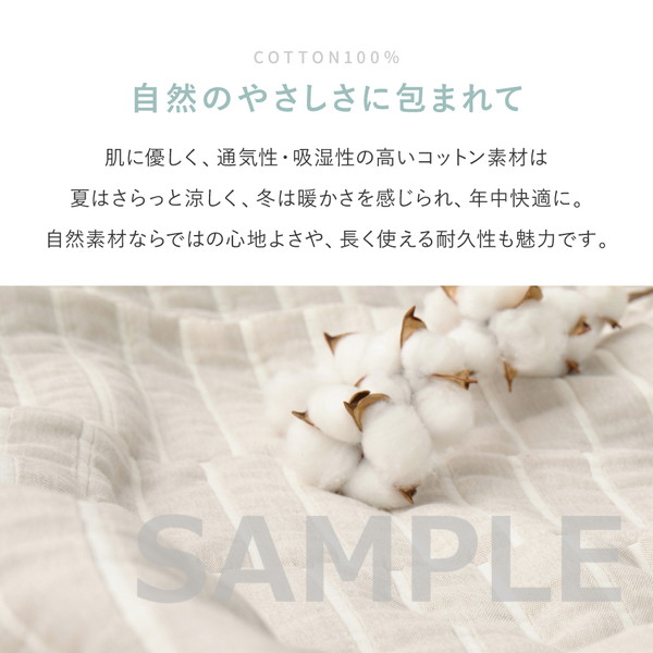 コットン100%のやさしさに包まれて、自然素材ならではの心地よさを感じるガーゼケット。肌に優しく、通気性・吸湿性の高いコットン素材は、夏はさらっと涼しく、冬は暖かさを感じられ、年中快適にお使いいただけます。毎日気兼ねなく使えるよう、ご家庭で気軽に丸洗いOK。また、洗うたびにやわらかさが増していくのも嬉しいポイント。日々の暮らしに寄り添いながら、使うほどふんわりと馴染みます。柔らかなトーンのやさしい色合いに、ふっくらと立体的な織りでナチュラルな中にも高級感のあるデザイン。インテリアに自然と溶け込みながらも、さりげない華やかさをプラスしてくれるアイテムです。