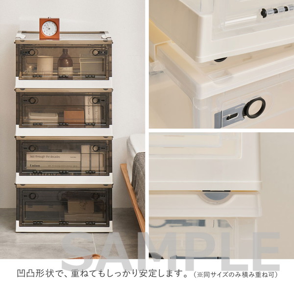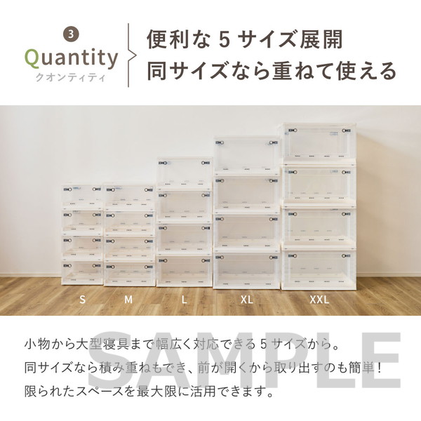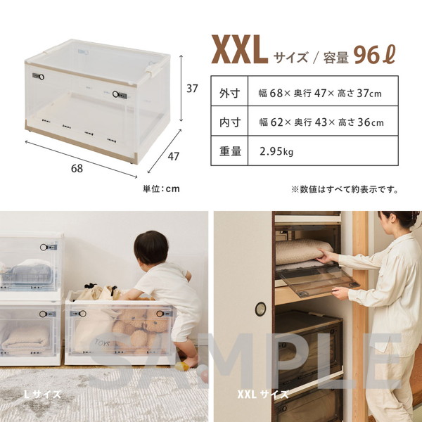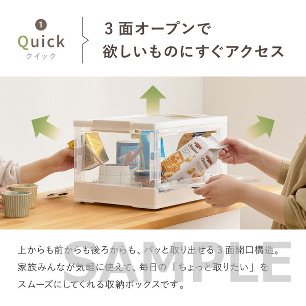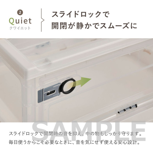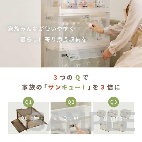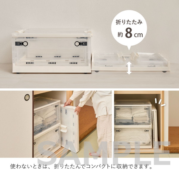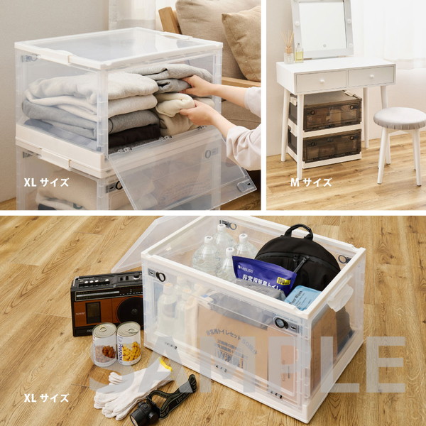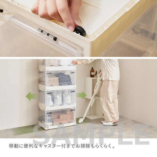 上・前・後ろの3面から開閉できる折りたたみ収納ボックス。中身が見えて、欲しい物にすぐ手が届く、家族みんなが使いやすい、暮らしに寄り添う収納に。スライドロック式のため、開閉音を抑えながら中身をしっかり守ります。使わないときは約8cmまで折りたたんで省スペースに収納可能。キャスター付きで移動もしやすく、掃除の際も手間がかかりません。サイズは小物から寝具まで対応できる全5サイズ展開。同サイズなら積み重ねもでき、リビングや押し入れなど限られた空間を有効活用したい日常収納に最適なアイテムです。