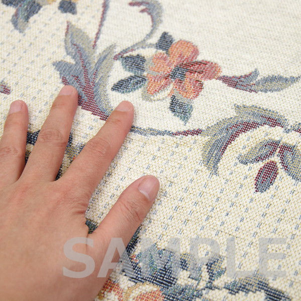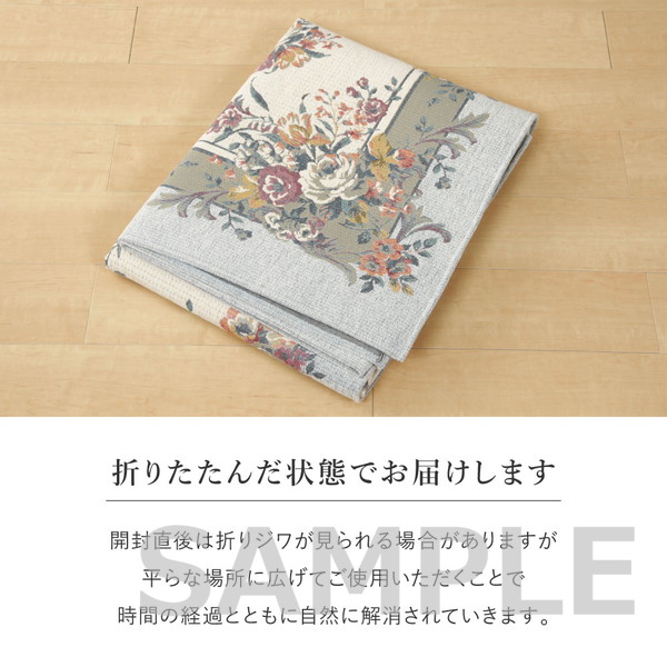 たくさんの花束モチーフが空間を上品に彩る、ゴブラン織りシェニールラグ。ビロードのような毛羽をもつシェニール糸を使用し、さらりとなめらかな肌触りで季節を問わず快適に使えます。はっ水加工により、飲み物をこぼしてもサッと拭き取りやすく、汚れが気になるときは手洗いも可能。約5mmのウレタン入り三層構造で、程よい厚みとクッション性があり、くつろぎ時間や家族団らんに心地よさをプラスします。裏面は滑り止め付きでズレにくく、ホットカーペット・床暖房にも対応。リビングやダイニングなど、日常使いしやすい一枚です。