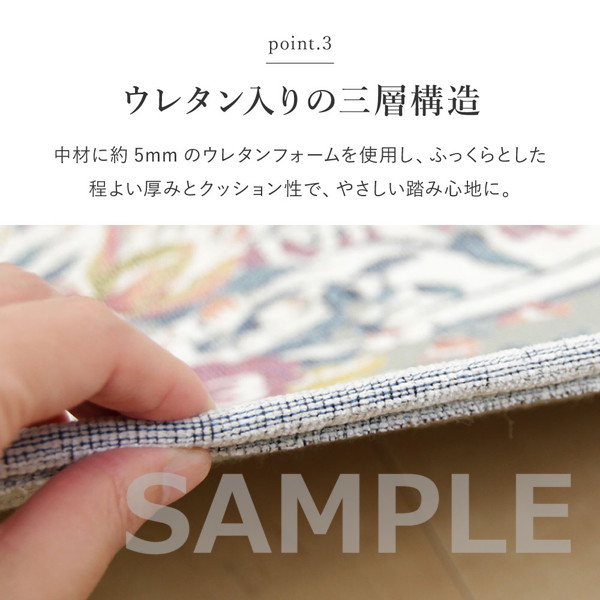 | 素材 | 表面:ポリエステル100% 中材:ウレタンフォーム5mm 裏面:不織布(滑りにくい加工) |