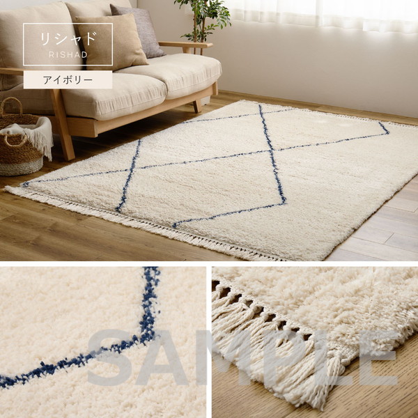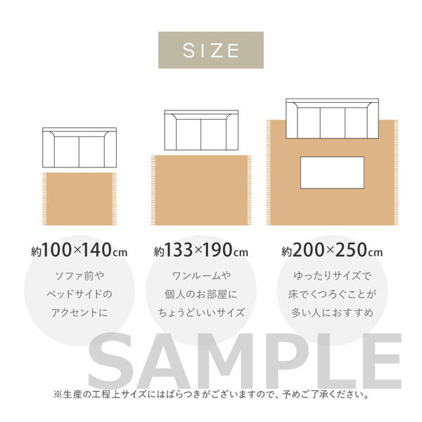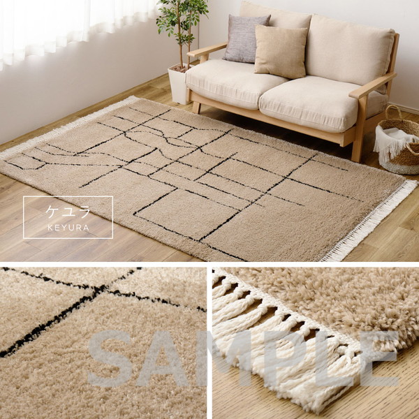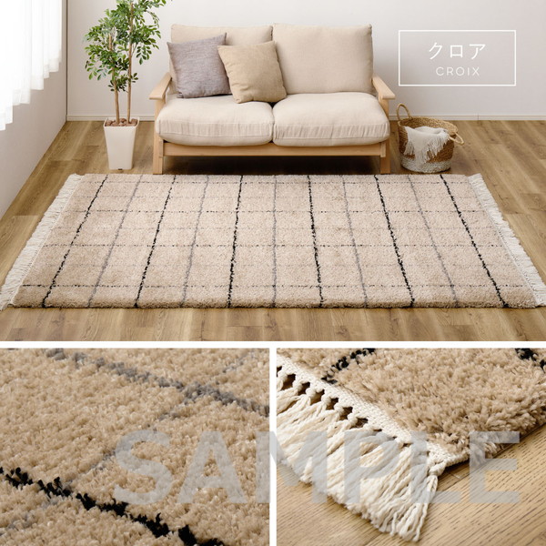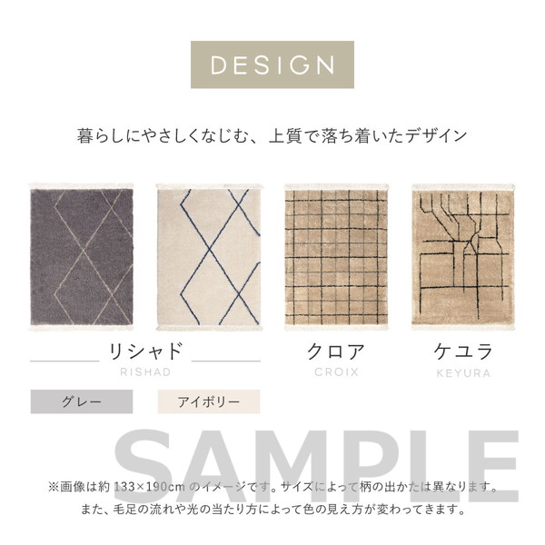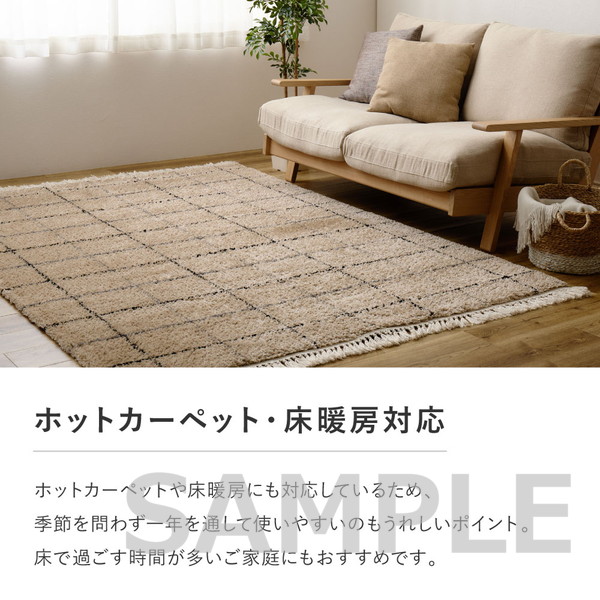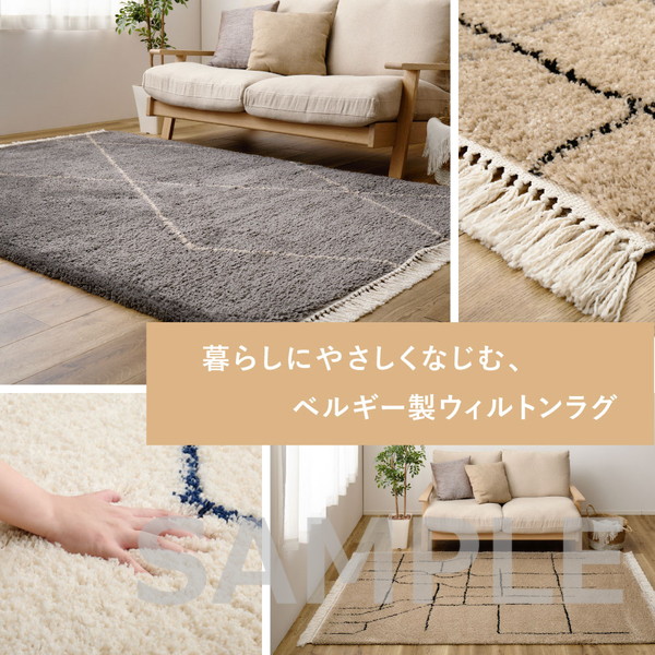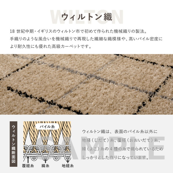 ヒートセット加工により、なめらかな触感と遊び毛の出にくさにも配慮。ホットカーペット・床暖房対応で、季節を問わず一年を通して使用できます。落ち着いたデザインはワンルームからリビングまで取り入れやすく、ソファ前やベッドサイドなど、日常のさまざまなシーンで活躍するウィルトンラグです。
