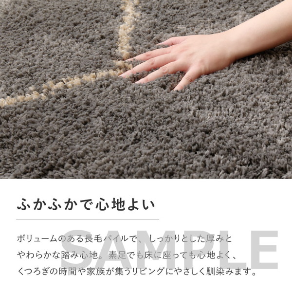ウィルトン織で仕立てた、上質感と使いやすさを兼ね備えたラグです。約35mmの長毛パイルにより、ふかふかとした厚みとやわらかな踏み心地を実現。素足でも床に座っても心地よく、家族が集うリビングやくつろぎの時間に自然となじみます。