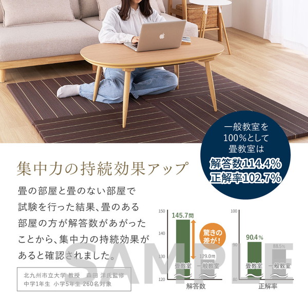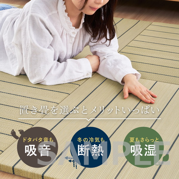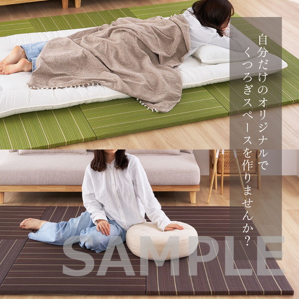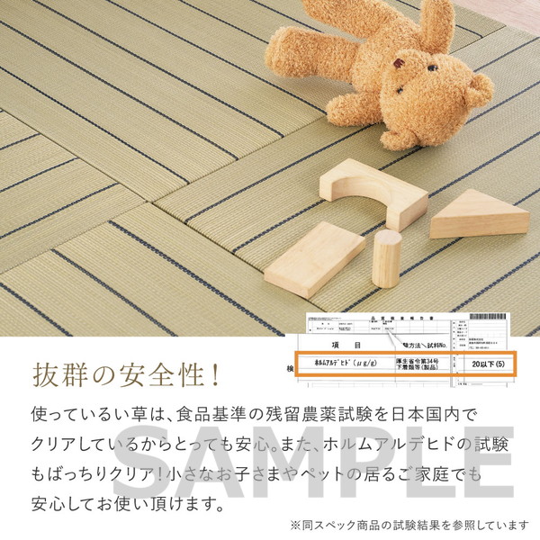| 素材 | 表面:い草100% 中材:ポリエチレン・ポリスチレン(硬質発泡スチロール) 裏面:不織布 滑り止め付き(裏面5カ所) |