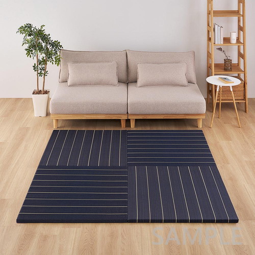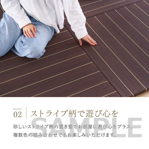 ストライプ柄のデザインが空間に程よいアクセントを加え、リビングのくつろぎスペースやキッズスペース、ヨガや読書の時間にもおすすめ。ホルムアルデヒド試験をクリアしており、小さなお子さまやペットのいるご家庭でも安心して使える置き畳です。
