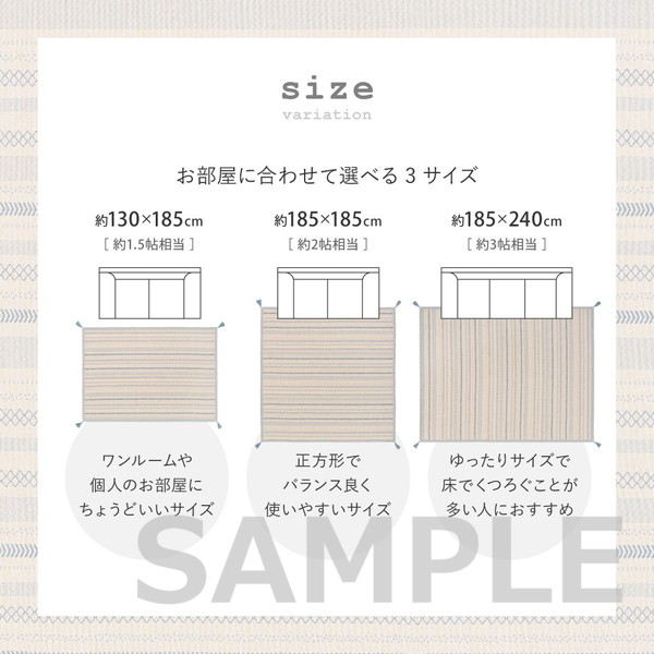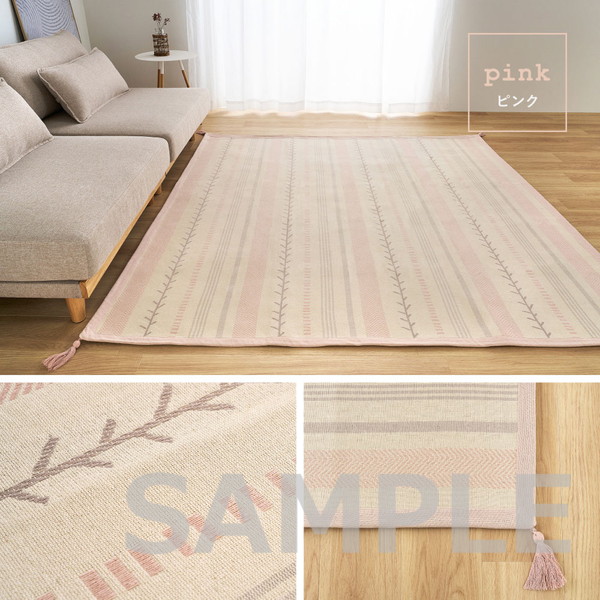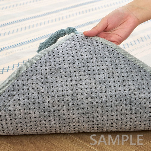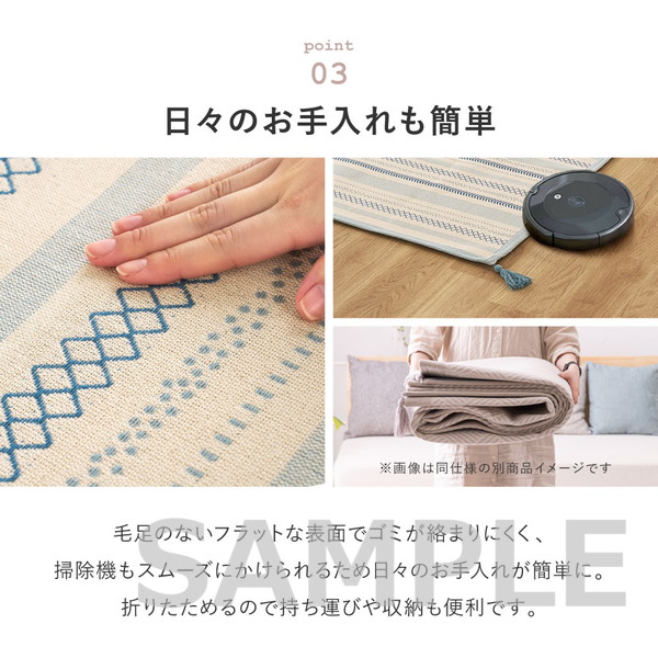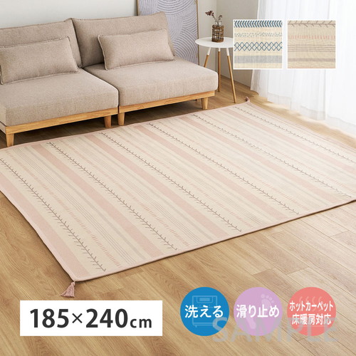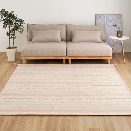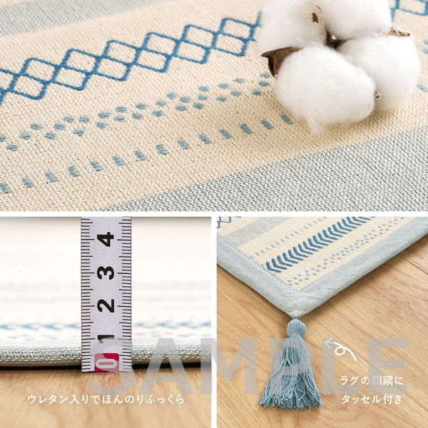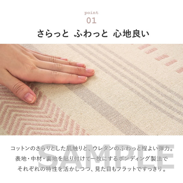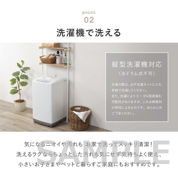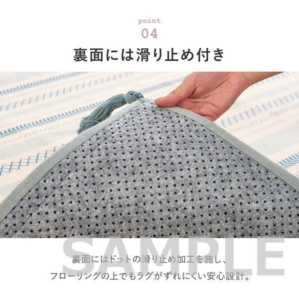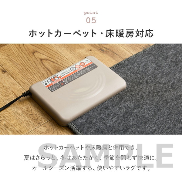 さらっとした肌ざわりと高い吸湿性で蒸し暑い季節も快適に使えます。ウレタン入りのボンディング製法により、ふんわりと程よい弾力をプラス。洗濯機で洗えるため、小さなお子さまやペットのいるご家庭でも清潔を保てます。滑り止め付きでフローリングでも使いやすく、ホットカーペット・床暖房にも対応。オールシーズン活躍する使いやすいラグです。