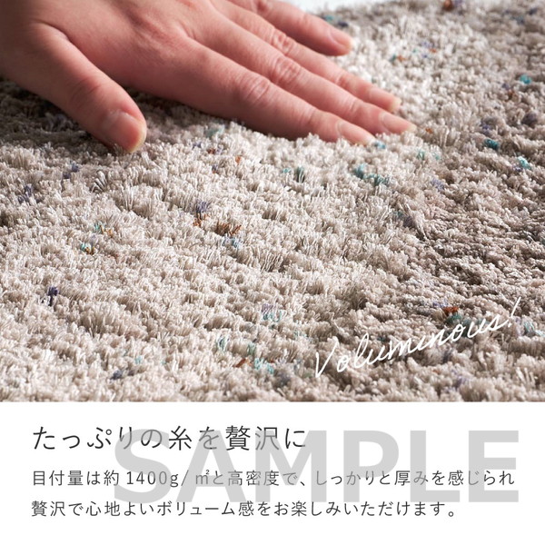 目付量は約1400g/㎡の高密度仕様。たっぷりの糸を使用した厚みのある仕上がりで、心地よいボリューム感を楽しめます。リビングやベッドサイドなど、くつろぎの空間づくりに。