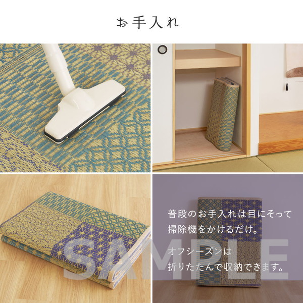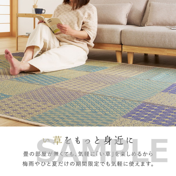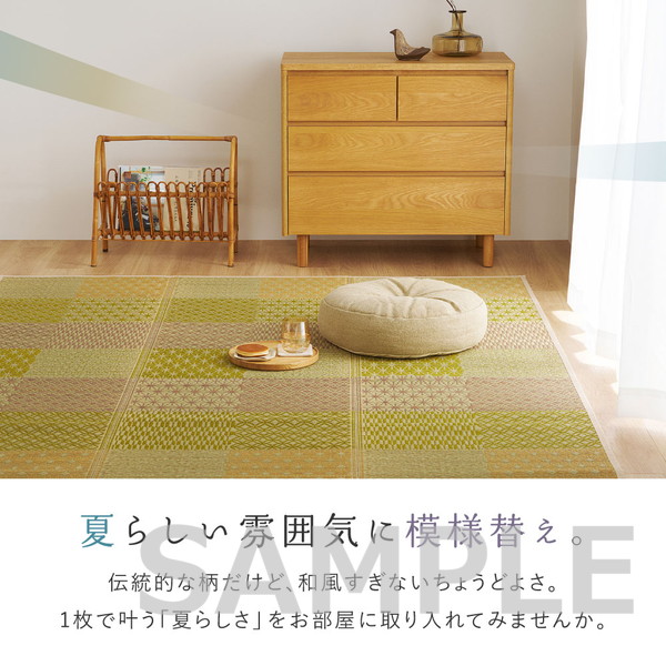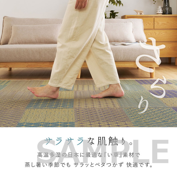 高温多湿な日本の気候に適したい草素材を使用し、蒸し暑い季節でもサラッとした肌触りで快適に過ごせます。お部屋に自然な涼しさと落ち着きを取り入れたい方におすすめ。折りたたんで収納できるため、季節使いにも便利な一枚です。