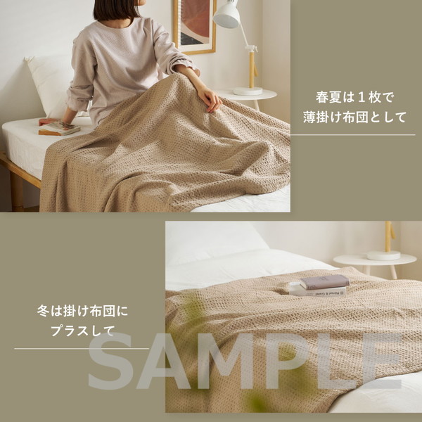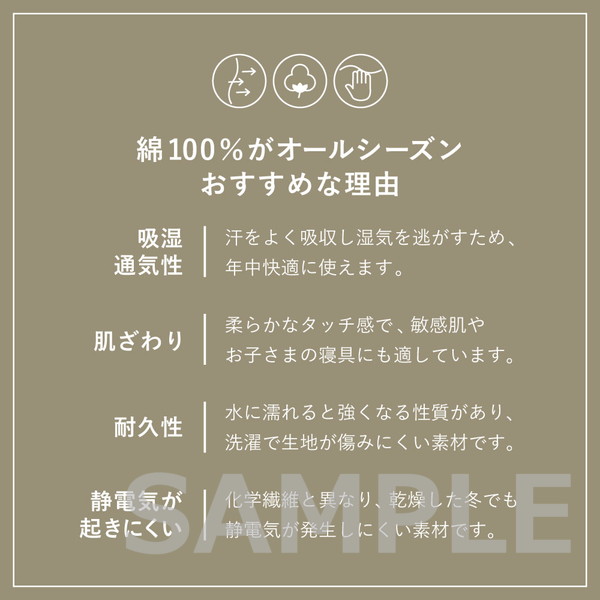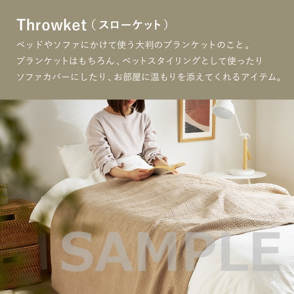 綿100%を使用した、オールシーズン快適に使えるスローケットです。吸湿性と通気性に優れ、汗ばむ季節もさらりとした使い心地。やわらかな肌ざわりで、敏感肌の方やお子さまにも安心してお使いいただけます。