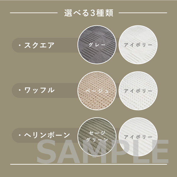 シンプルなデザインでインテリアにもなじみやすく、デザインはワッフル・ヘリンボーン・スクエアの3種類からお選びいただけます。